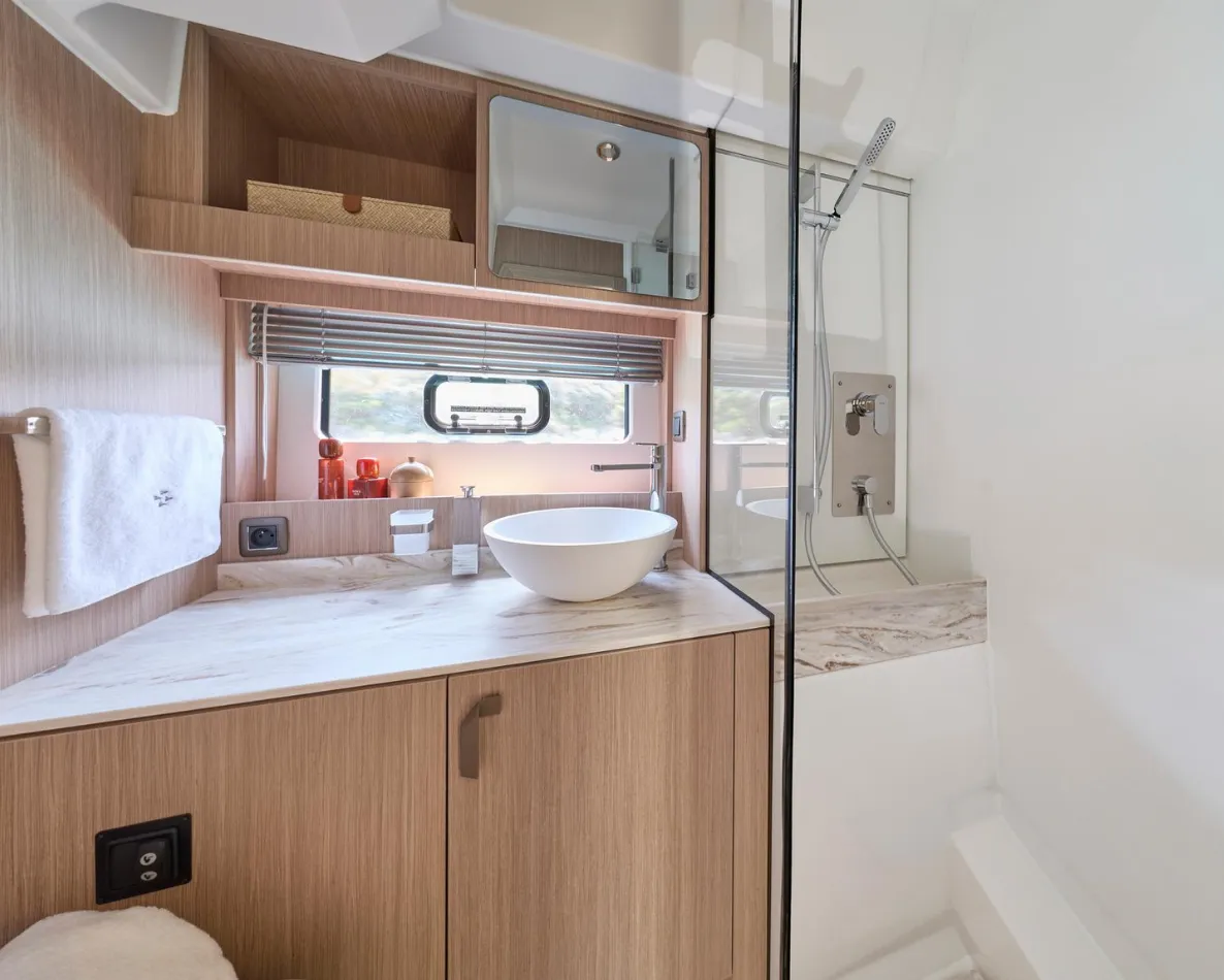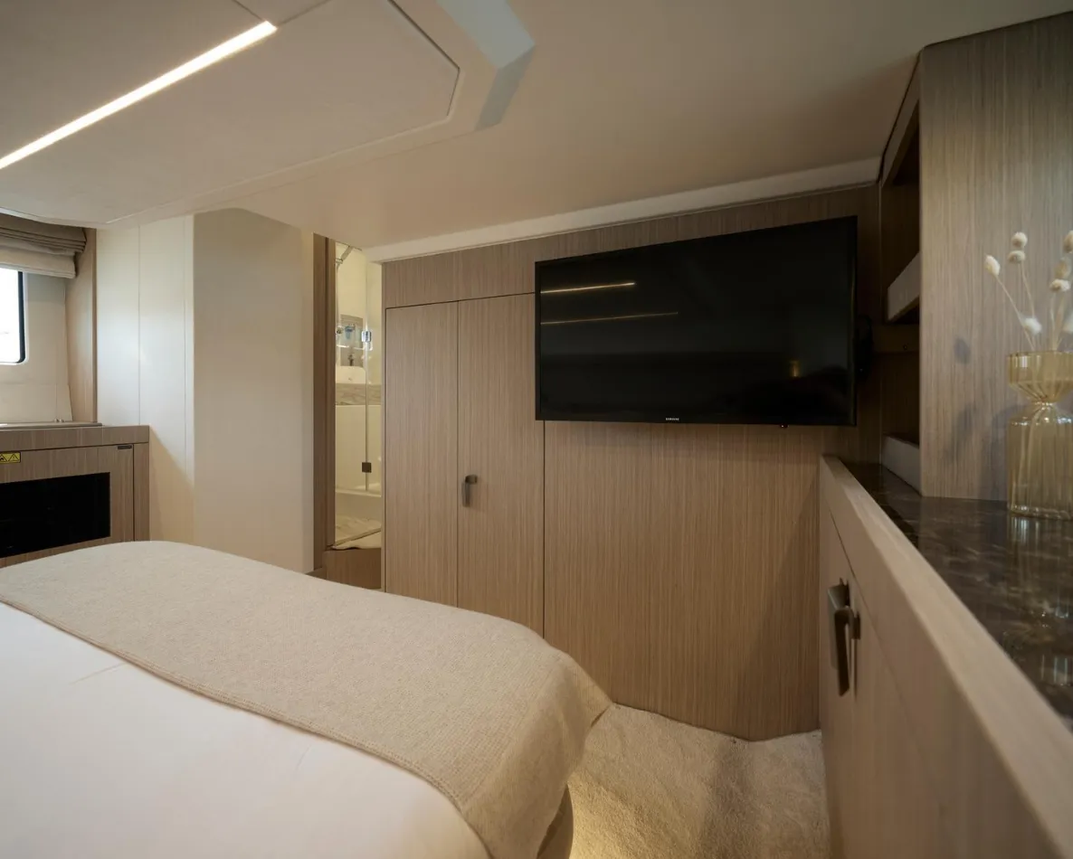 Le cabine sono state progettate all'insegna del lusso e della raffinatezza. Al centro dello yacht c'è una meravigliosa suite armatoriale, ampia e luminosa. A prua, le cabine VIP offrono lo stesso design elegante con una vista incantevole sul mare grazie alle larghe finestre panoramiche.