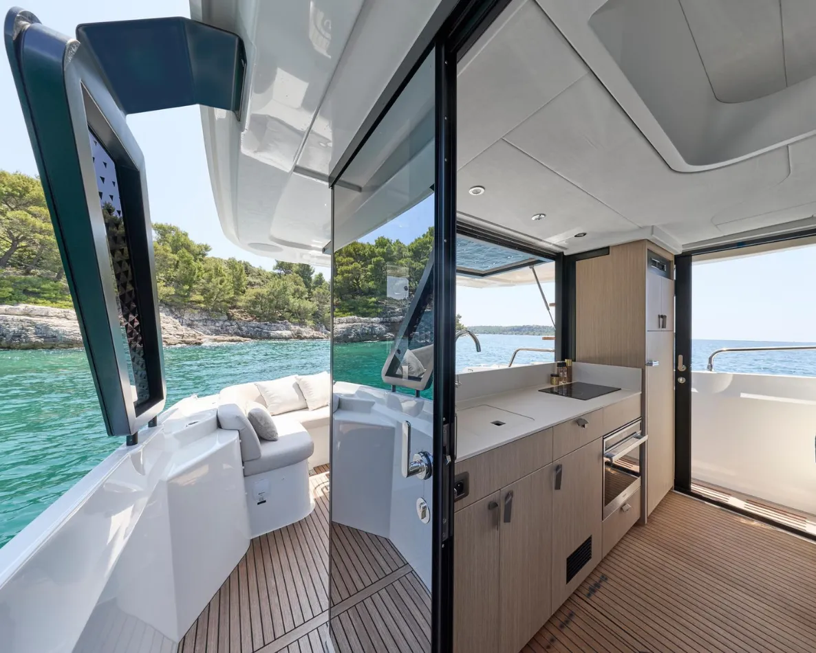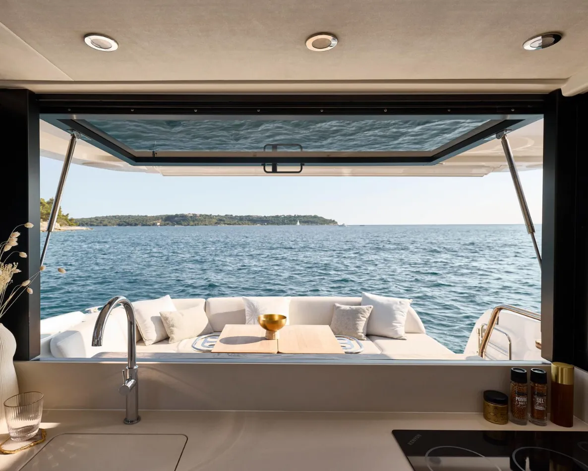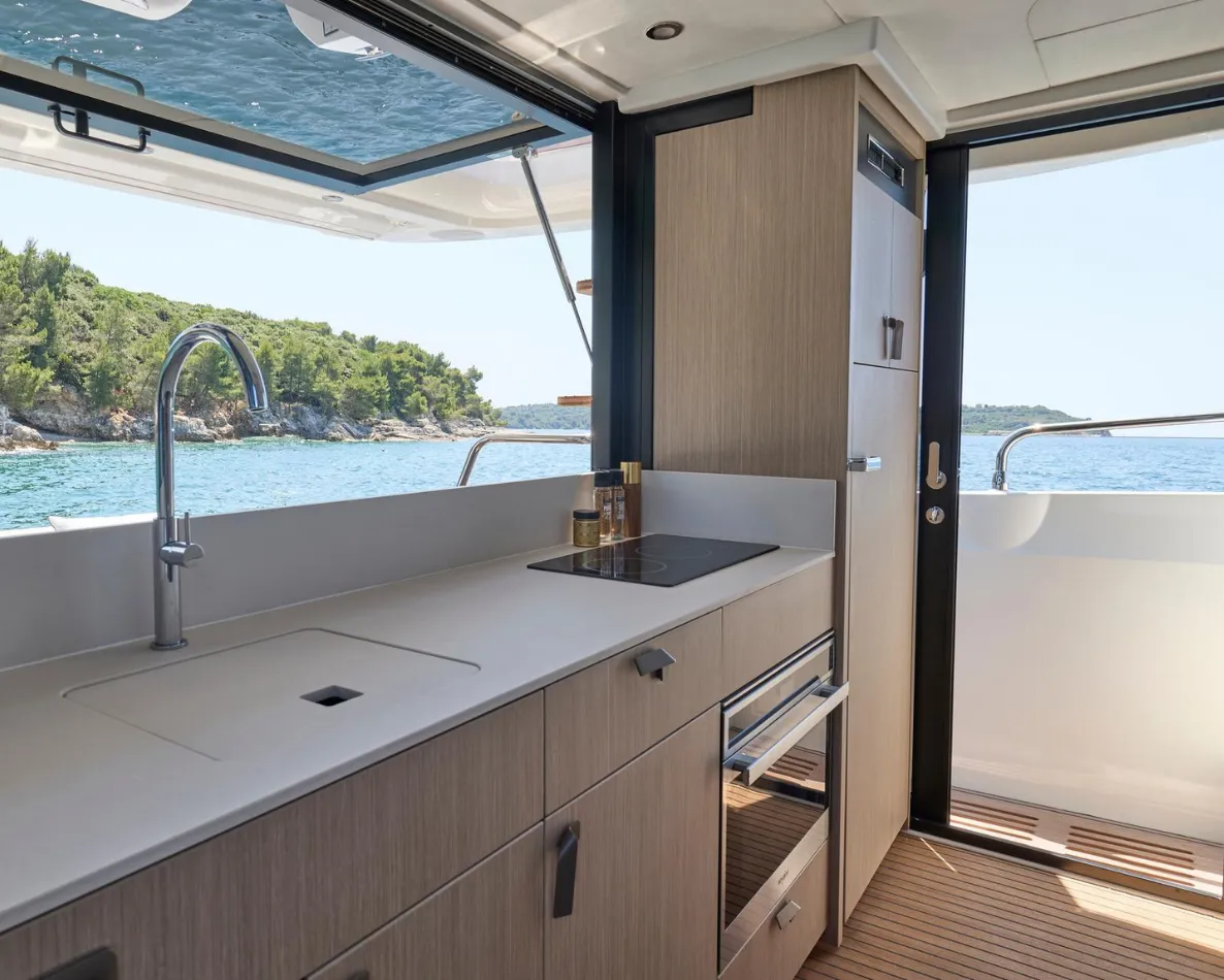 Affacciandosi direttamente sul pozzetto, la cucina offre una vista mozzafiato sul mare, integrando così alla perfezione gli spazi interni con l'ambiente esterno. Questa novità permette uno spazio per cucinare più ampio, ordinato ed equipaggiato al meglio con opzioni, come la cantina per i vini, che danno l'idea di vivere il mare in pieno stile.